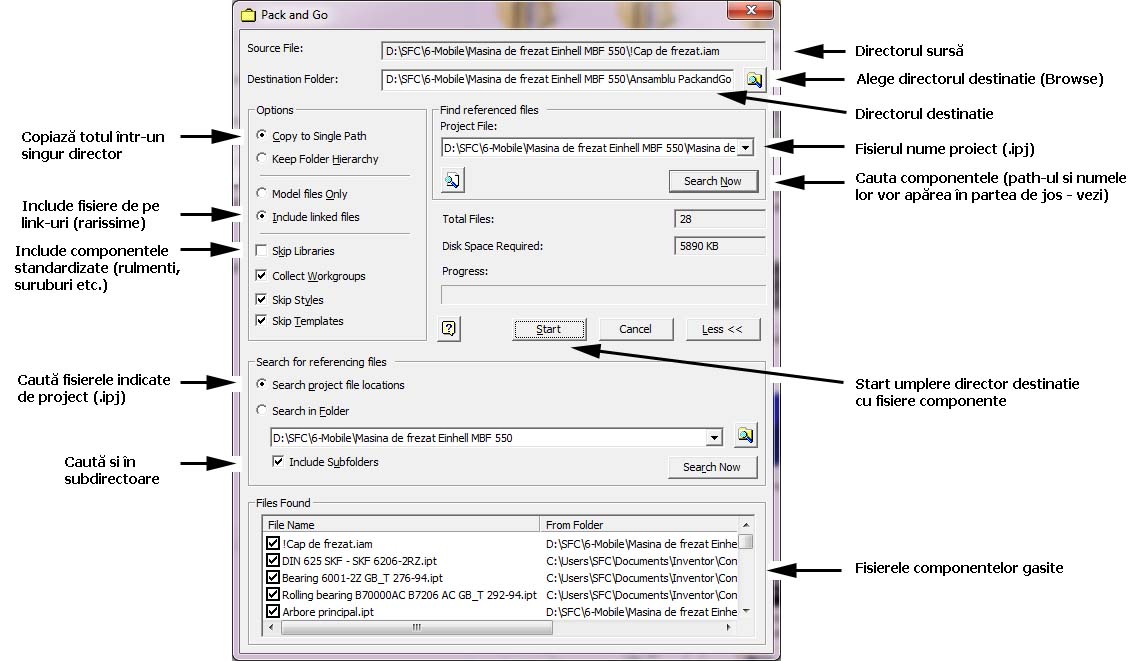 Atunci când doriți să-mi trimiteți un ansamblu spre a-l analiza va trebui să-mi includeți atât fișierul .iam, cât și TOATE componentele sale, fie că sunt proiectate de voi, fie că sunt luate din Content Center, ori se află în (sub)directoare diferite. Pentru a vă asigura că le-ați adunat pe toate într-un singur director veți folosi procedura Pack and Go. - vezi Pack and Go - Utilizare eficienta. Compactați în format .zip sau .rar acel director cu tot conținutul lui, puneți-i NumelePrenumele vostru (așa cum scrie mai sus) și trimiteți-mi-l cu încredere!